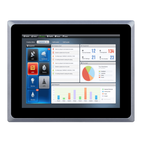• 屏幕12.1"分辨率1024×768,铝合金前面板IP65防水,可选电容触摸屏或电阻触摸屏