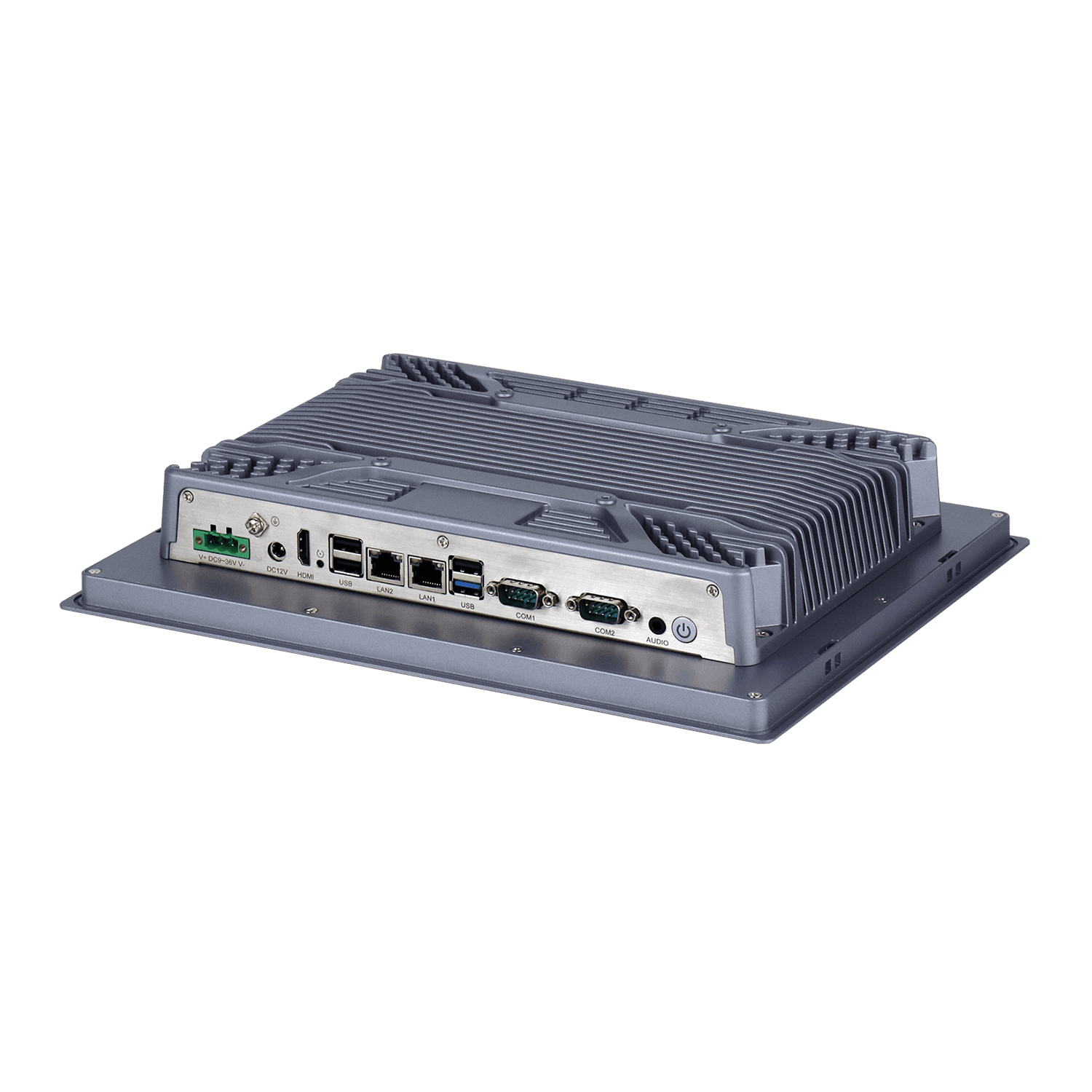 无风扇 嵌入式 强固型 工业平板电脑 支持宽温环境(-20°C至60°C),全封闭铝鳍无风扇的设计,保障更高效散热和强固防振性,使其成为更可靠的工业平台,提供安全接地部件更有效保护设备。屏幕12.1英寸LED背光工业屏,铝合金前面板符合IP65防水标准,可选全平面电容触摸屏或电阻触摸屏。