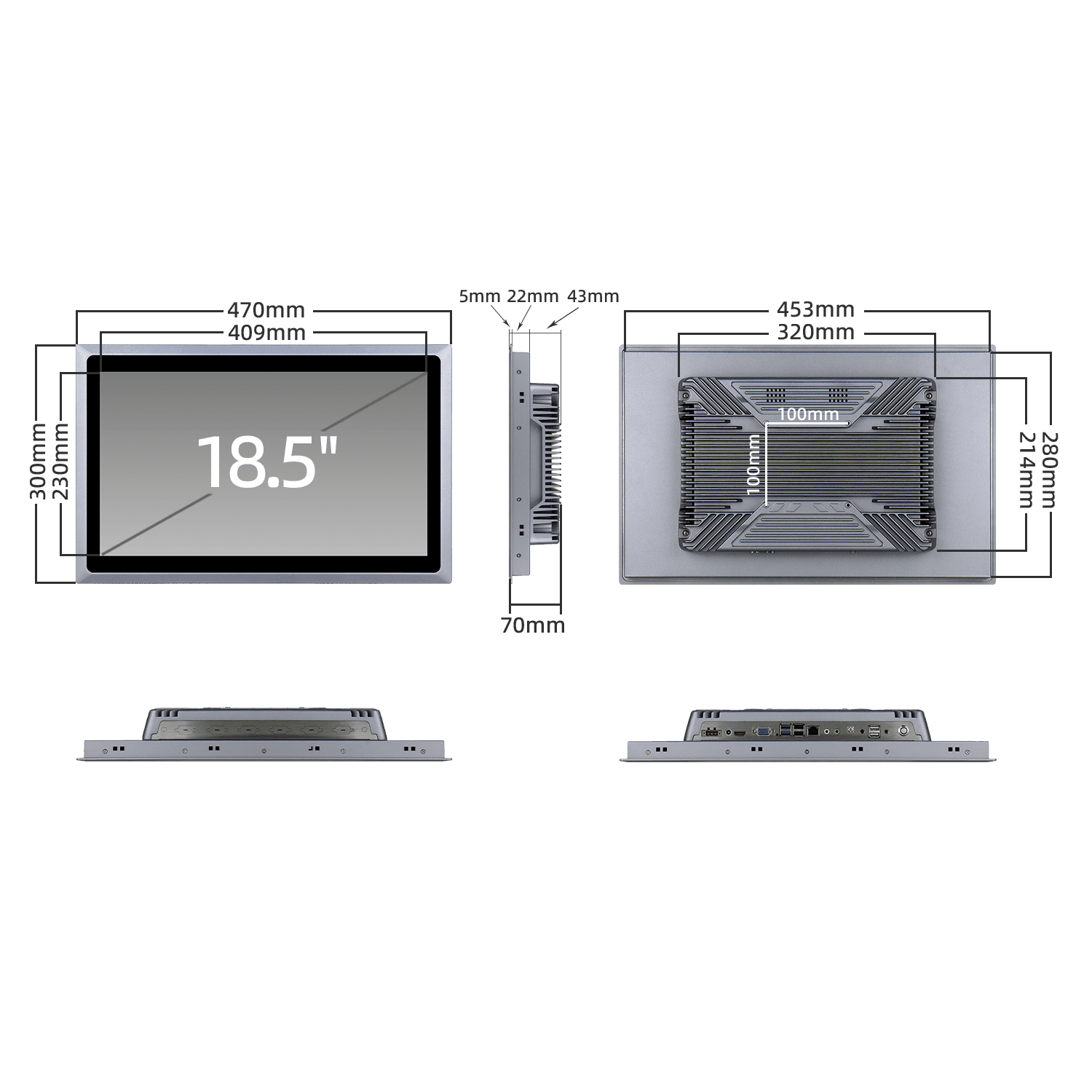 • 屏幕18.5"分辨率1920×1080,铝合金前面板IP65防水,可选电容触摸屏或电阻触摸屏