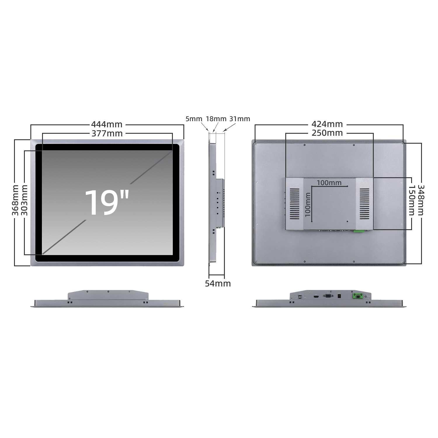 电阻 触摸屏 工业显示器 提供丰富的显示输入接口:VGA+HDMI或VGA+DVI+HDMI,电压输入支持DC 12V和2PIN凤凰端子,提供安全接地的部件有效保护设备,可选防振缓冲防水胶条防止水分渗入箱体,支持嵌入式和VESA标准安装方式,可以快速地使用各种通用支架或支撑臂方便灵活安装。